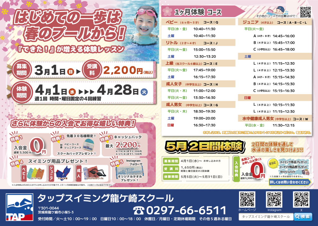 【龍ケ崎スクール】4月1カ月体験のお知らせ